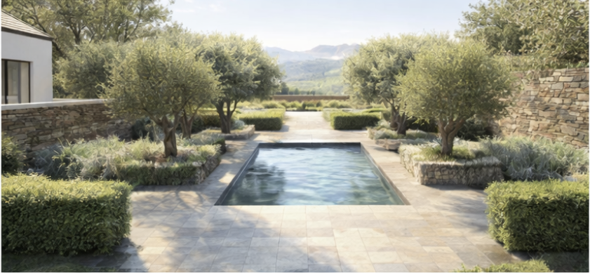 Verde Niwa recently completed a private estate garden designed to bring structure, calm, and seasonal rhythm to a contemporary Napa Valley property. The project began with a focus on creating a clear spatial framework that connected the villa’s architecture to the surrounding landscape. Inspired by Italian Renaissance proportion and Japanese garden restraint, the design introduced a central reflecting pool, layered planting beds, and natural stone pathways that guide movement through the space. Olive trees, sculpted pines, and soft perennial plantings were selected to create contrast between formality and natural growth, allowing the garden to feel intentional without appearing rigid.